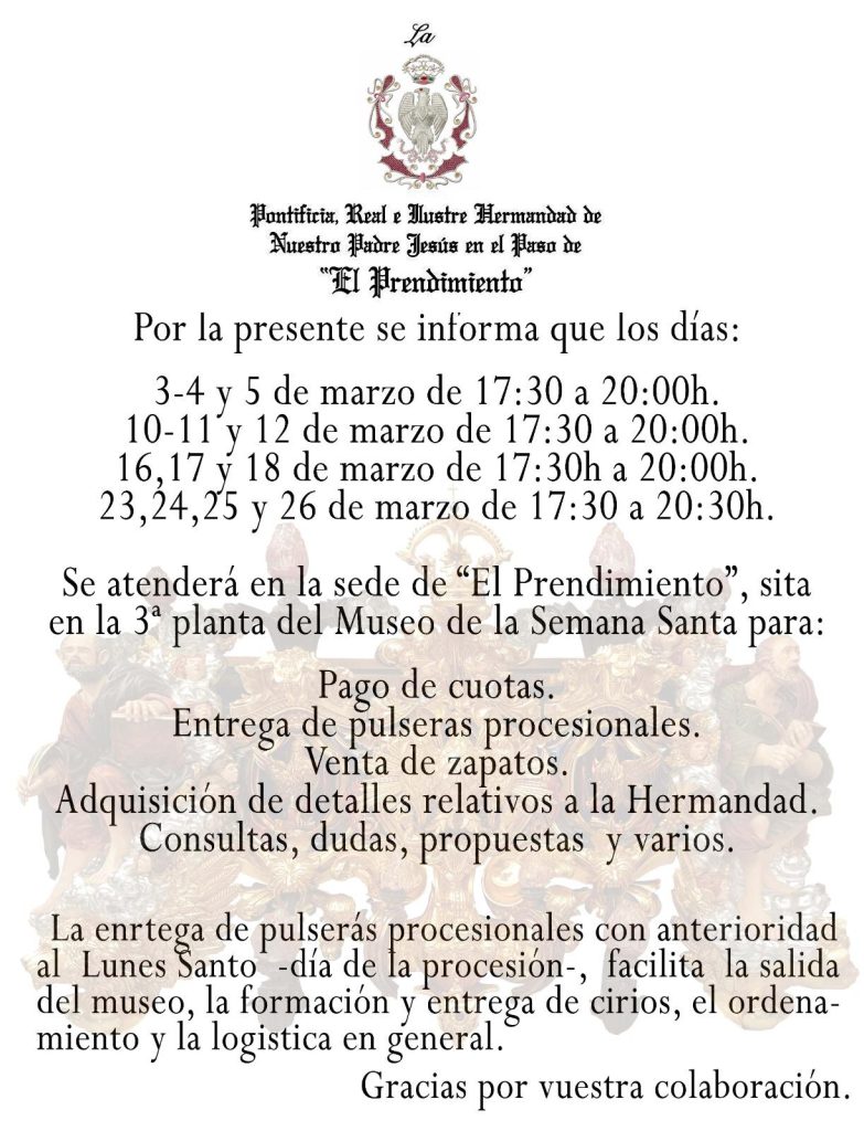 La Pontificia, Real e Ilustre Hermandad de Nuestro Padre Jesús en el Paso de “El Prendimiento” ha informado de la apertura de varios días de atención presencial en su sede, ubicada en la tercera planta del Museo de la Semana Santa.