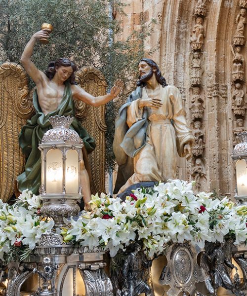 El Ángel tiene unas facciones extraordinariamente dulces y serenas, clásicas más que barrocas, de alas estilizadas que recuerdan la época del Renacimiento. La figura de Jesús, inmensamente dolorosa, muestra el tremendo momento de soledad y amargura que está viviendo mientras que sus discípulos reposan dormidos debajo de un olivo; son 5 figuras a tamaño natural que expresan serenidad y dulzura, sufrimiento y amargura, quietud y sosiego.
